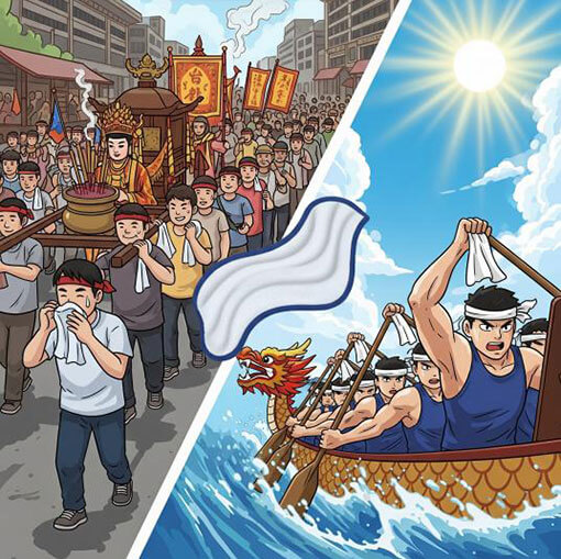 「加油!加油!」每到端午節,全台各地的河畔都會響起震天的鼓聲與加油聲。龍舟選手們頭上綁著毛巾,不僅是為了防止汗水流到眼睛,更是一種精神力的展現。那條毛-巾,吸飽了選手們的汗水、決心與團隊的默契。